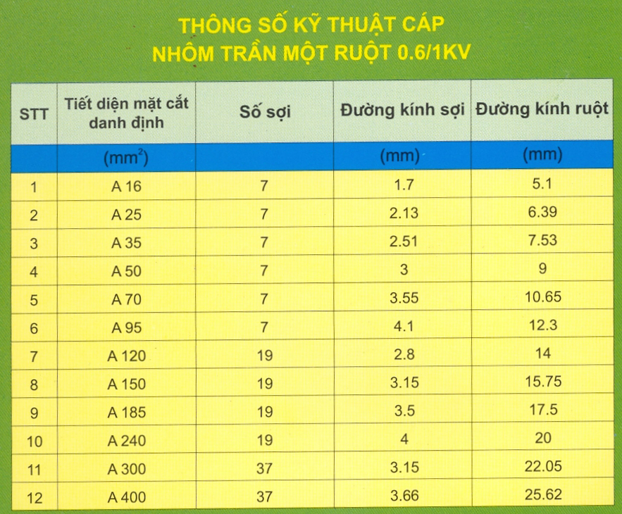 Bảng TSKT Dây nhôm bọc cách điện PVC